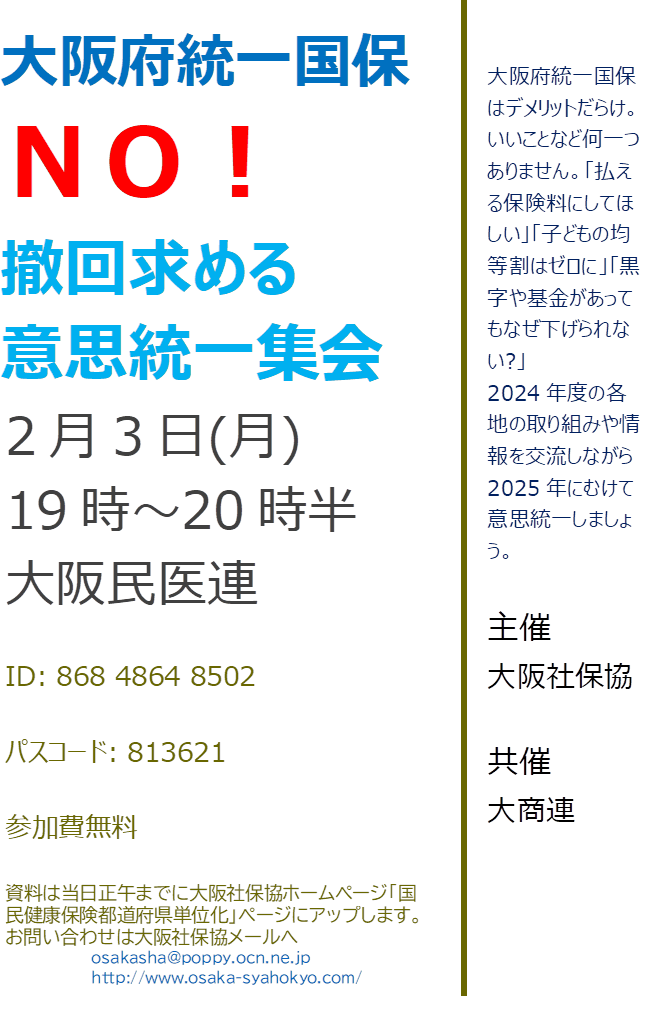 【スケジュール】 19:00 開会あいさつ 19:05 2025年度大阪府統一国保料についての大阪府からのレクチャー内容について 19:25 各地からの報告(豊中市・守口市・大阪市・寝屋川市・東大阪市・能勢町他) 20:10 2024年度大阪社保協自治体キャラバン行動での各自治体の動向及び今後のたたかいについて 20:30 閉会挨拶 |